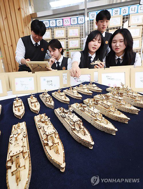 (수원=연합뉴스) 홍기원 기자 = '제10회 서해수호의 날'을 나흘 앞둔 24일 고(故) 박경수 상사 모교인 경기도 수원시 팔달구 삼일공업고등학교에서 학생들이 참수리 357정과 천안함 모형, 추모와 감사의 캘리그래피를 살펴보고 있다.