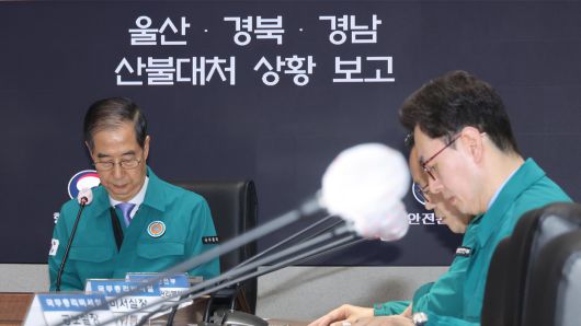▲ 헌법재판소의 탄핵 기각으로 직무에 복귀한 한덕수 대통령 권한대행 국무총리가 24일 정부서울청사 중앙재난안전대책본부에서 산불 상황 보고를 받고 있다.