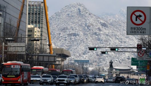 [서울=뉴시스] 추상철 기자 = 눈이 내린 18일 오전 서울 종로구 북악산이 눈으로 덮여 있다. 2025.03.18. scchoo@newsis.com /사진=추상철 |
