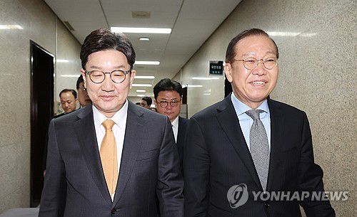 밝은 표정으로 이동하는 권영세 비대위원장과 권성동 원내대표 |