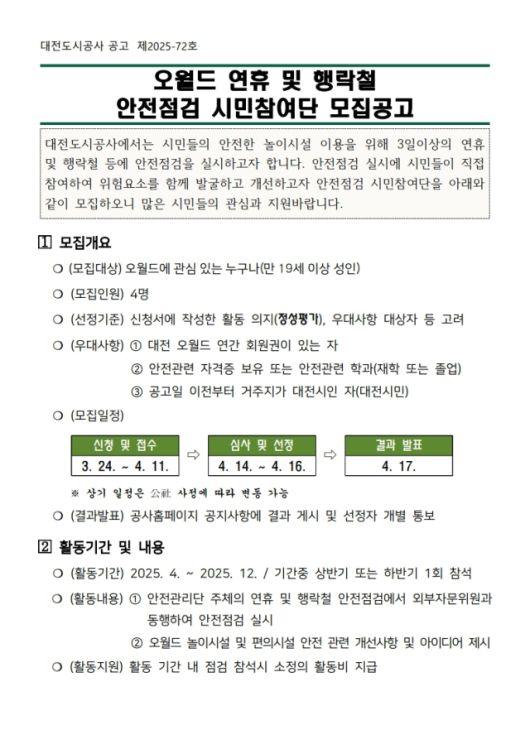 ▲대전오월드 '안전점검 시민참여단' 모집 공고문 ⓒ대전도시공사 |