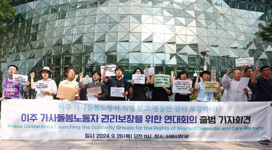 지난 2024년 9월 26일 서울시 중구 서울시청 앞에서 열린 이주 가사돌봄노동자 권리보장을 위한 연대회의 출범 기자회견에서 참석자들이 구호를 외치고 있다. 뉴시스 |