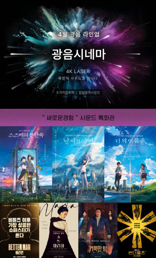 마지막으로 4월 30일엔 ‘액션의 타격감’을 맛볼 수 있는 영화 ‘거룩한 밤: 데몬헌터스’와 ‘썬더볼츠*’를 상영한다. 악마까지 때려잡는 ‘마동석’의 오컬트 액션으로 주목받고 있는 영화 ‘거룩한 밤: 데몬헌터스’는 ‘광음시네마’의 저음역대 우퍼를 통해 시원하고 통쾌한 사운드를 구현하여 온 몸을 떨리게 하는 짜릿한 쾌감을 선사할 예정이다. 또한 ‘어벤져스’의 뒤를 이을 마블의 팀업무비 ‘썬더볼츠*’도 상영한다. 제75회 프라임타임에미상 시상식에서 8관왕을 휩쓸며 전 세계적으로 큰 사랑을 받았던 ‘성난 사람들’의 제작진들이 대거 참여해 탄탄한 완성도를 자랑하며 플로렌스 퓨, 세바스찬 스탠, 데이빗 하버 등 할리우드 최고의 배우들이 모여 환상적인 연기 앙상블을 예고하며 역대급 블록버스터 액션은 물론 전매특허 명곡 OST이 ‘광음시네마’와 어우러져 폭발적인 시너지를 발휘할 것으로 보인다.
