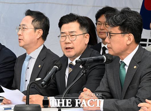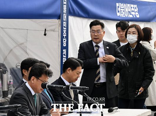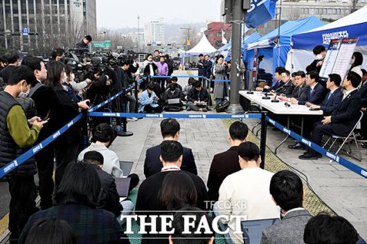 [더팩트ㅣ배정한 기자] 박찬대 더불어민주당 원내대표가 25일 오전 서울 종로구 광화문 인근에 설치된 천막당사에서 열린 원내대책회의에 참석해 모두발언을 하고 있다.