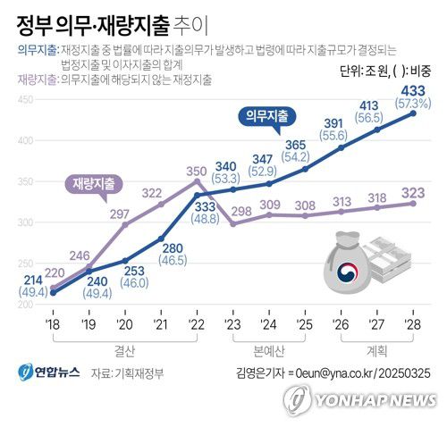 정부예산에서 의무지출이 차지하는 비중은 올해 54.2%에서 2028년 57.3%로 높아질 전망이다.