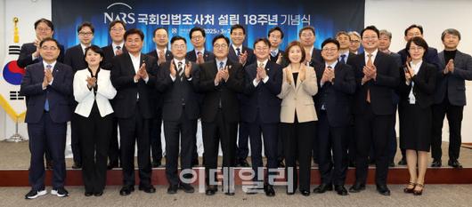 [이데일리 방인권 기자] 우원식 국회의장과 이관후 국회입법조사처장, 박찬대 더불어민주당 원내대표를 비롯한 참석자들이 25일 오후 서울 여의도 국회입법조사처 대회의실에서 열린 국회입법조사처 설립 18주년 기념식에서 기념촬영을 하고 있다.