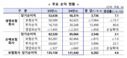25일 금융감독원이 발표한 ‘2024년 보험회사 경영실적’에 따르면 생명보험사 22개·손해보험사 32개의 당기순이익은 모두 14조1440억 원으로 전년 대비 4.6% 증가했다.