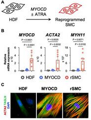 A.피부나 장기에서 흔히 볼 수 있는 섬유아세포를 마이오카딘과 올트랜스레티노익산을 이용해 평활근세포로의 직접교차분석리프로그래밍법 개발. B.직접리프로그래밍된 평활근세포(rSMC)에서 대조군과 비교해 평활근세포 특이적 유전자 발현의 증가를 확인했다. C.rSMC에서 평활근세포 특이적 단백질 발현이 확인됐다. |