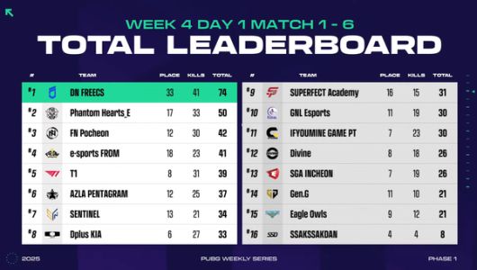'국내 1황' DN 프릭스가 'PUBG 위클리 시리즈(PWS)' 4주차 첫날 경기에서도 1위에 오르며 독주 체제를 굳혔다.