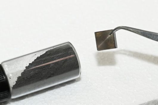 한국재료연구원(KIMS) 나노재료연구본부 박지훈·김종우 박사팀 개발한 망간-비스무스 분말과 영구자석. 재료연구원 제공 |