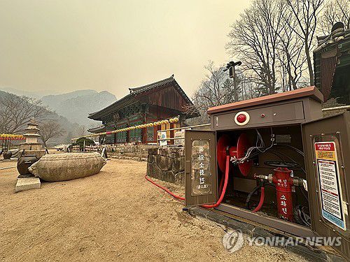 사찰 관계자들은 마당에 설치된 옥외소화전에 소방 호스를 연결해 사찰 주위 곳곳에 물을 뿌려가며 피해를 막기 위해 애쓰고 있다.