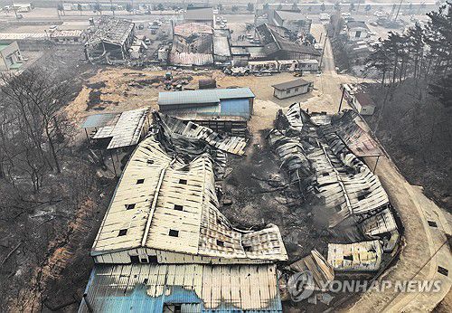 (영덕=연합뉴스) 윤관식 기자 = 26일 경북 영덕군 영덕읍 한 자동차 정비소가 산불에 휩쓸린 가운데 차들이 불에 타 있다.