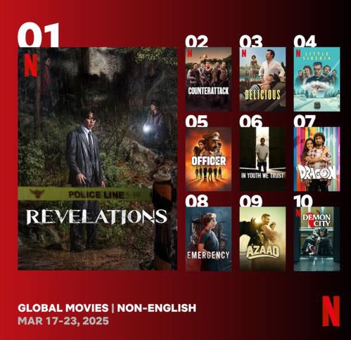 26일 넷플릭스 공식 사이트인 '넷플릭스 톱 10'에 따르면 3월 17∼23일 일주일간 영화 '계시록'의 시청 수(시청 시간을 상영 시간으로 나눈 값)는 570만으로 집계돼 넷플릭스 비영어 영화 시청 1위에 올랐다.