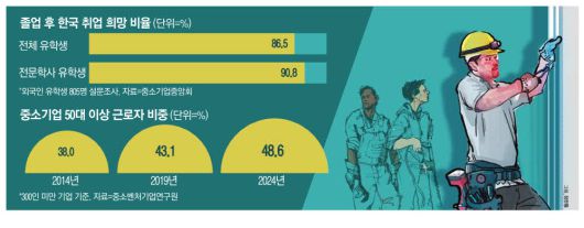 청년층의 중소기업 기피 현상이 가속화되면서 중소기업이 고령화되고 인력난이 심해지는 가운데 중소기업계는 한국에서 공부하는 외국인 유학생을 중소기업에 취업시켜 인력 운용의 숨통을 틔워달라고 목소리를 높이고 있다. 실제 중소벤처기업연구원에 따르면 300인 미만 중소기업에서 일하는 직원 중 50대 이상 비중은 2014년 38.0%에서 지난해 48.6%로 껑충 뛰었다. 중소기업에서 일하는 직원 2명 중 1명이 50대 이상이라는 얘기다.