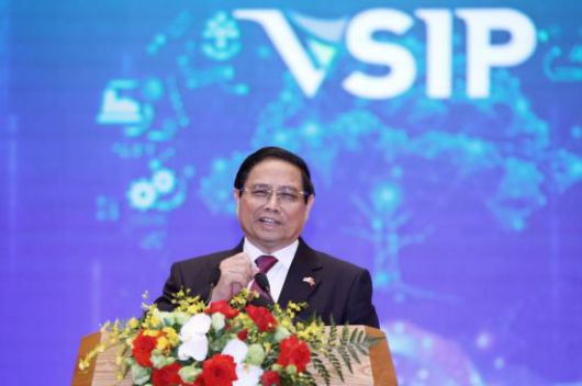 팜 민 찐 베트남 총리가 지난달 26일 베트남 하노이 정부청사에서 열린 VSIP 타이빈 산업단지 조성 사업 착공식에서 연설하고 있다. /EPA통신·연합뉴스 |