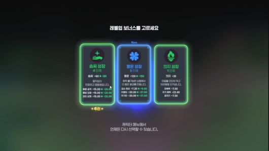 여러모로 시행착오를 겪어야 하는데 레벨업 보너스는 1회차 기준 10골드만 지불하면 다른 능력치로 바꿀 수 있다. 어렸을 적 RPG 게임을 하다가 스탯 잘못 찍고 '망캐' 소리 듣고 울면서 다시 키울 걱정은 하지 않아도 된다는 의미다.