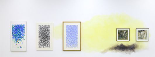 ‘수채: 물을 그리다’ 전시장에는 윤종숙이 노랗게 수채화 벽화를 그렸다. 왼쪽 곽인식의 수채화 세 점은 이건희컬렉션이다. [사진 국립현대미술관] |