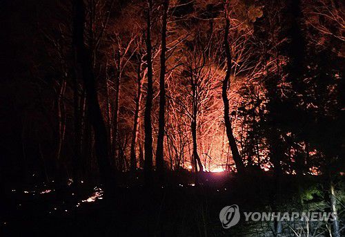 (순창=연합뉴스) 26일 전북 순창군 쌍치면 한 야산에서 났다가 잡힌 산불이 27일 오전 되살아나 주변으로 번지고 있다. 2025.3.27 [전북특별자치도 소방본부 제공. 재판매 및 DB금지]