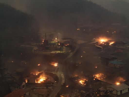 경북 의성군 산불 발생 나흘째인 25일 의성군 단촌면 하화1리에 강풍에 날아온 산불 불씨로 인한 화재가 발생해 있다. (사진=연합뉴스) |