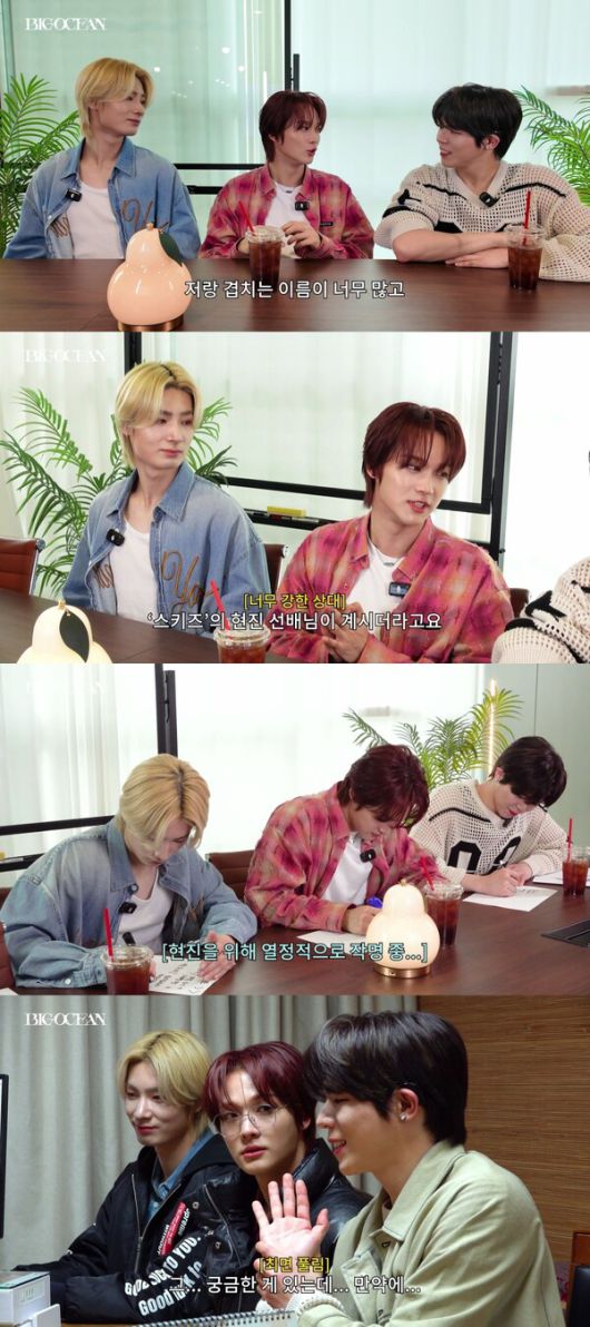 ‘오션뷰’ 1화에서는 빅오션 현진의 예명을 정하는 모습이 그려졌다. 현진은 “제가 본명으로 활동하고 있는데 제 이름을 검색하니까 겹치는 이름이 너무 많고, 그중에서도 스트레이키즈의 현진 선배님이 계신다. 본명 대신에 예명으로 활동할 만한 좋은 이름이 있지 않을까 생각해서 같이 고민을 해보게 됐다”라고 털어놨다.
