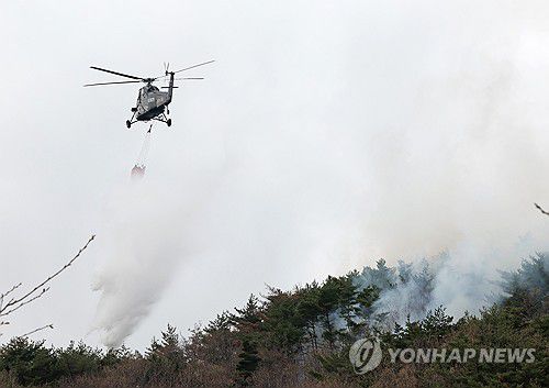 [울주 산불 지역에 물 뿌리는 헬기. 연합뉴스 제공] |