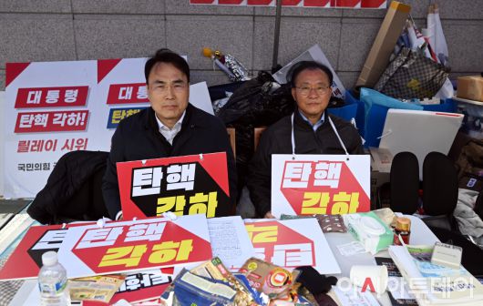 아시아투데이 박성일 기자 = 윤석열 대통령 탄핵심판 선고를 앞둔 27일 서울 종로구 헌법재판소 인근 윤재옥 의원(오른쪽)을 비롯한 국민의힘 의원들이 릴레이시위를 이어가고 있다. ⓒ "젊은 파워, 모바일 넘버원 아시아투데이"