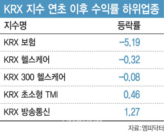 27일 엠피닥터에 따르면 대표 보험주 10개 종목으로 구성된 ‘KRX 보험’ 지수는 올해 들어 1897.95에서 1799.41로 5.19% 하락했다. 총 34개 KRX 지수 가운데 가장 큰 폭으로 떨어졌고, 하락한 3개 지수(KRX 셀스케어 -0.32%, KRX 300 헬스케어 -0.08%) 가운데서도 낙폭이 가장 크다.