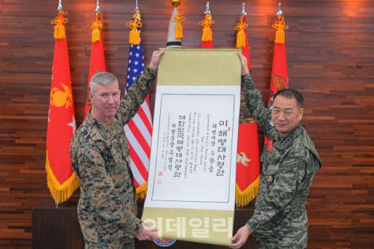 주일석 해병대사령관이 스미스 미 해병대사령관에게 수한울이라는 한글이름 족자를 전달하고 있다. (사진=해병대) |