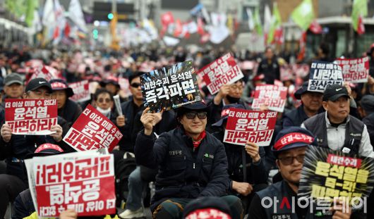 아시아투데이 박성일 기자 = 전국민주노동조합총연맹(민주노총)이 27일 오후 서울 종로구 광화문광장에서 '윤석열 즉각 파면! 내란세력 청산! 사회대개혁 쟁취!' 총파업 총력투쟁대회를 하고 있다. ⓒ "젊은 파워, 모바일 넘버원 아시아투데이"