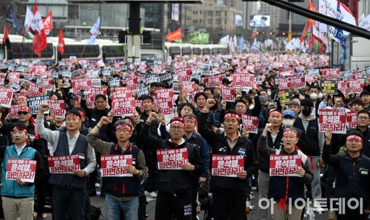아시아투데이 박성일 기자 = 전국민주노동조합총연맹(민주노총)이 27일 오후 서울 종로구 광화문광장에서 '윤석열 즉각 파면! 내란세력 청산! 사회대개혁 쟁취!' 총파업 총력투쟁대회를 하고 있다. ⓒ "젊은 파워, 모바일 넘버원 아시아투데이"