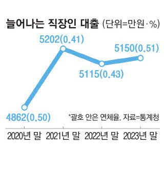 이날 통계청이 발표한 '2023년 일자리행정통계 임금근로자 부채'에 따르면 2023년 말 임금근로자의 연체율은 전년보다 0.08%포인트 오른 0.51%로 조사됐다. 전년 0.02%포인트 상승에 이어 2년 연속 오름세다. 은행 연체율은 0.04%포인트 올랐고, 비은행은 0.19%포인트 상승했다. 2022년부터 이어진 기준금리 인상 기조로 상환 여력이 떨어진 것으로 풀이된다. 2023년 근로자들의 평균 대출금액은 5150만원으로 전년보다 0.7% 상승했다. 2017년 조사가 시작된 후 꾸준히 증가하던 평균 대출액이 2022년 처음으로 감소했지만 다시 증가세로 돌아섰다.