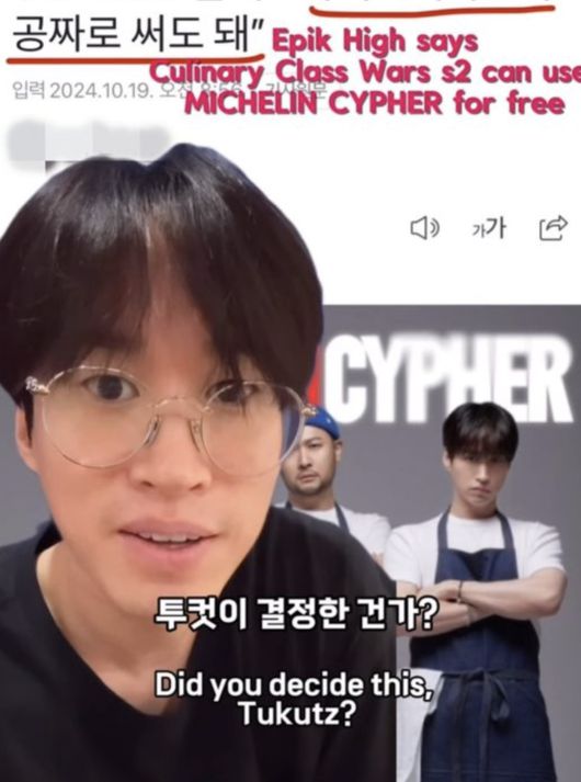 공개된 영상 속에는 타블로가 당황한 얼굴로 에픽하이 관련 기사를 캡처한 모습이 담겨 있다. 그는 "뻥 안치고 저도 이거 기사 보고 알았어요. 투컷이 결정한 건가?"라고해 웃음을 안겼다.신곡 '미슐랭 CYPHER' 음악, '흑백요리사 시즌2'에서 공짜로 써도 된다고 발표했기 때문.