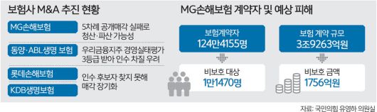 보험사 인수합병(M&A)이 줄줄이 난항을 겪으며 보험가입자들의 피해 우려가 커지고 있다. 5차례나 매각이 무산된 MG손해보험은 청산·파산 가능성이 제기되며 가입자들이 보험상품을 줄줄이 해지하고 국민청원 등 단체행동에 나섰다. 우리금융지주가 최근 금융감독원 경영실태평가에서 3등급을 받자 인수를 추진 중인 동양·ABL생명 가입자들도 불안해하고 있다.