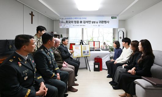 27일 경기 하남시 소재 고 김석연 일병의 딸 김문숙씨 자택에서 이근원 국방부 유해발굴감식단장(왼쪽 다섯번째)이 유족에게 김 일병의 참전 경로 등을 설명하고 있다. 국방부 제공 |