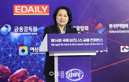 유명희 전 산업통상자원부 통상교섭본부장(서울대 국제대학원 객원교수)이 이데일리가 27일(현지시간) 베트남 하노이 랜드마크72에서 개최한 제14회 ‘국제 비즈니스·금융 컨퍼런스(IBFC)’ 개회식에서 기조강연을 하고 있다. (사진=노진환 기자) |
