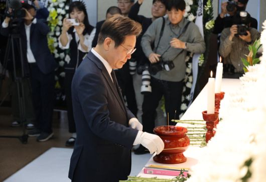 26일 공직선거법 위반 사건 항소심에서 무죄를 선고받은 더불어민주당 이재명 대표. 27일 오후 의성 산불을 진화하다 헬기 추락사고로 희생된 고 박현우 기장의 분향소가 마련된 의성군청소년문화의집 다목적 강당을 찾아 헌화하고 있다. 연합뉴스 |