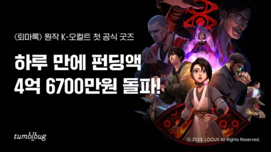 텀블벅의 퇴마록 굿즈 펀딩은 시작 전부터 화제를 모았다. 사전 예약 접수 하루 만에 4200여명이 신청하며, 텀블벅 역사상 최대 사전 알림 신청자 수 프로젝트에 등극했다. 현재 펀딩 달성률이 1만6500%를 넘어섰다는 점과 펀딩 종료까지 약 한 달이 남아있는 점을 고려할 때, 최종 누적 펀딩 금액은 애니메이션 굿즈 분야 사상 최대치를 기록할 것으로 예상된다.