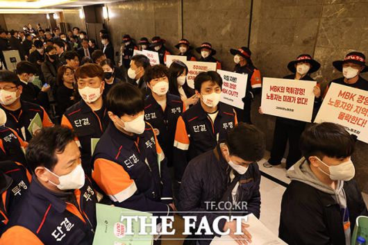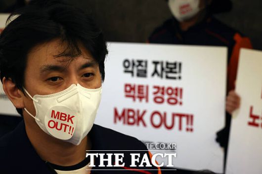 이날 민주노총 서비스연맹 마트산업노조원들이 주총장 앞에서 MBK를 규탄하는 모습. |