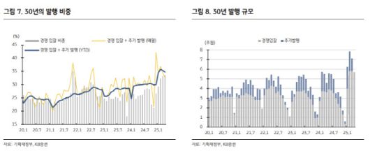 그는 커브 정상화 의지가 엿보인다고 평가했다. 연초부터 지속되는 30년물 강세로 기재부는 1분기 30년의 발행 비중을 34.6%로 높게 유지하는 등 20~50년 초장기물 비중은 42.6%로 가이드라인 비중이던 30~40%를 상회하는 수준을 유지하고 있다.