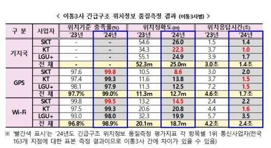다만 위성항법 시스템(GPS) 방식은 2023년 대비 위치기준 충족률이 97.7%에서 99.0%, 위치응답시간이 4.6초에서 1.7초로 향상됐지만 위치정확도는 11.3m에서 12.7m로 다소 낮아졌다.
