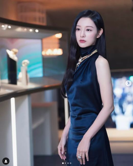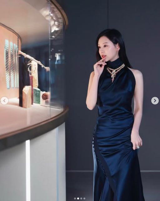 사진 속 김지원은 홀터넥 네이비 실크 드레스를 입고 새로운 앰버서더가 된 주얼리 브랜드 전시회에 참석한 모습이 담겼다. 그는 몸매 라인을 드러내며 기품있고 우아한 매력을 물씬 풍겼다.