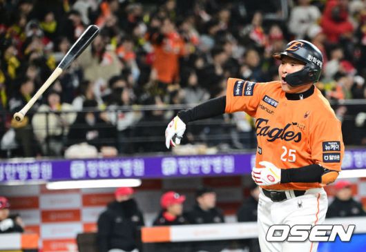 7회말 2사 주자없는 상황 한화 김태연이 추격의 좌월 솔로포를 날리고 배트를 던지며 환호하고 있다. 2025.03.28 / dreamer@osen.co.kr