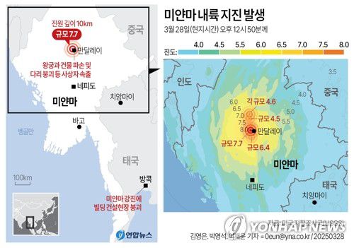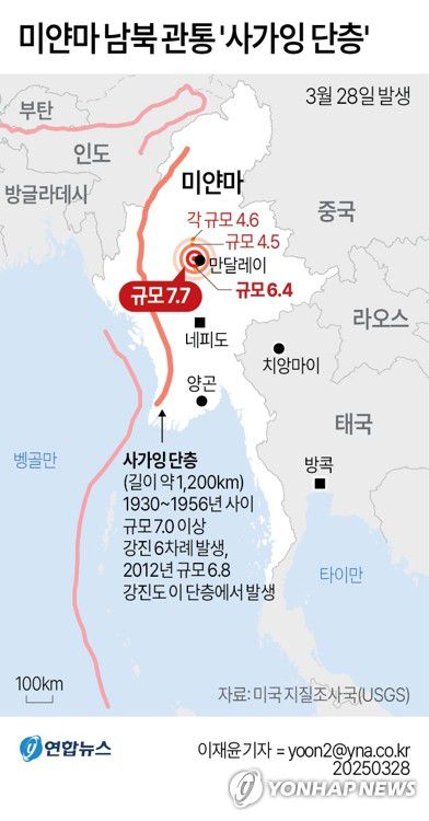 (서울=연합뉴스) 권수현 권숙희 기자 = 28일 규모 7.7 강진이 일어난 미얀마는 여러 개의 지각판이 맞닿은 곳에 있어 이전부터 지진 위험지역으로 꼽혀왔다.