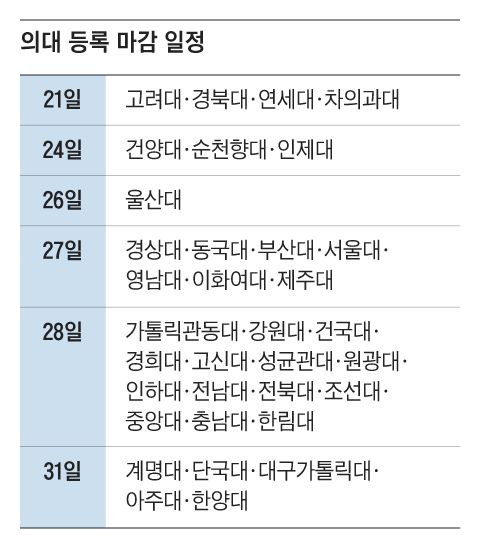 이날 등록을 마감한 다른 의대 13곳에서도 예상보다 많은 학생이 복귀 의사를 밝힌 것으로 전해졌다. 이날 등록을 마감하려 했던 가톨릭대는 “학생 상당수가 계속 복학 신청을 하고 있어 30일까지 기한을 늘려주기로 했다”고 했다. 교육계 관계자는 “이른바 ‘빅5 의대(서울대·연세대·성균관대·가톨릭대·울산대)’는 학생 상당수가 일단 등록은 하자는 분위기”라고 했다.