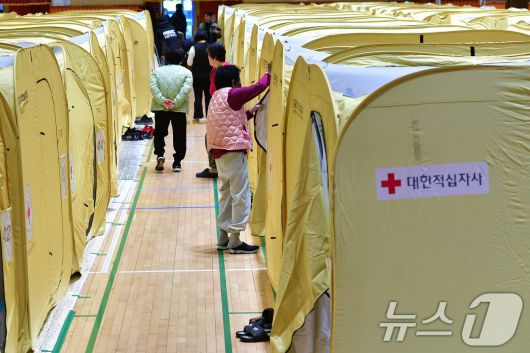 경북 영덕군 산불 이재민 대피소인 영덕읍국민체육센터에 임시 텐트 100여개가 설치됐다. 국민체육센터에는 지품면과 매정리 등 이재민 400여명이 나흘째 대피해 있다. ⓒ News1 최창호 기자 |