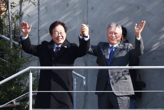 올해 1월30일 문재인 전 대통령이 경남 양산시 사저를 방문한 더불어민주당 이재명 대표와 만나 지지자들을 향해 인사하고 있다. 뉴스1 |