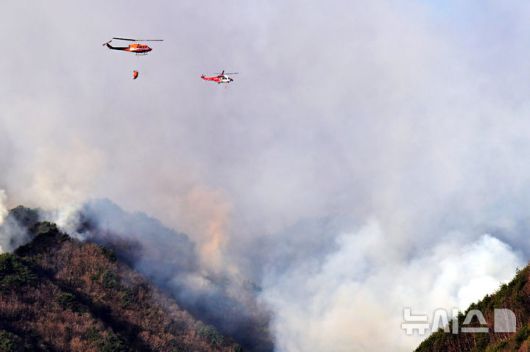 [산청=뉴시스] 차용현 기자 = 경남 산청 산불 발생 9일째를 맞은 29일 오전 동이트자 산불진화헬기가 진화작업을 펼치고 있다. 2025.03.29. con@newsis.com |