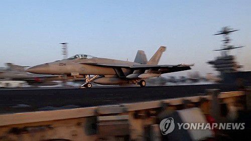 예멘 후티 반군 폭격을 위해 항공모함에서 이륙하는 F/A-18 전폭기 |