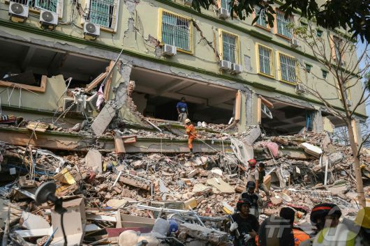 (서울=뉴스1) 김지완 기자 = 미얀마에서 발생한 규모 7.7의 강진으로 두 번째로 큰 도시인 만달레이의 한 아파트가 무너져 90명 이상이 갇혔다고 적십자가 29일(현지시간) 밝혔다.