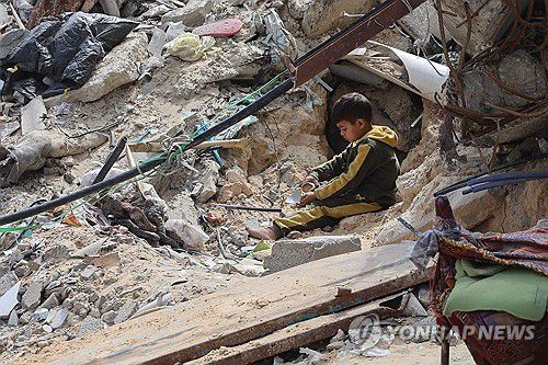 건물 잔해에서 놀고 있는 가자지구 어린이 |